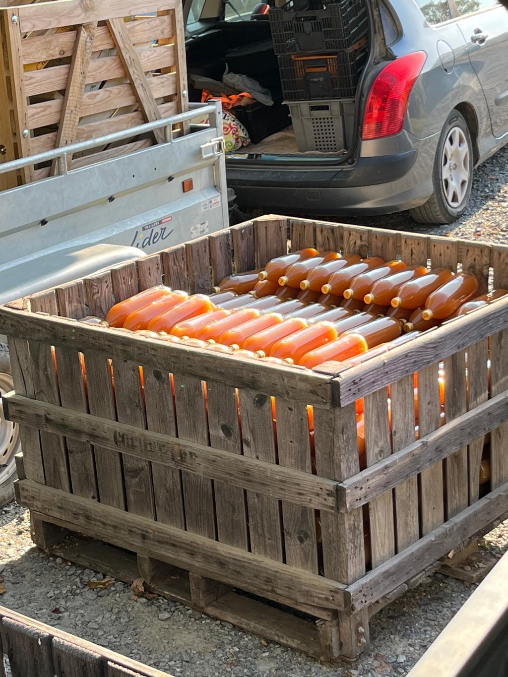 Des brioches de St Sylvain d'Anjou, des compotes du Haut Anjou et surtout le jus de pomme pressé par des bénévoles de l'école, issu de pommes ramassées par les familles.